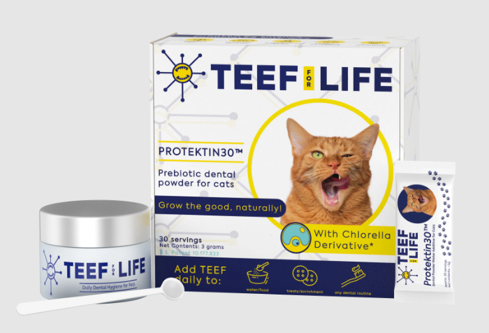 Say goodbye to your cat’s bad breath, unhealthy gums and dirty teeth! TEEF For Cats is a simple dental additive for cats that corrects the microbiome of the entire mouth through molecular nutrition. Add a tiny scoop (included in kit) to your cat’s water or food daily and watch as their dental health and overall wellbeing improve greatly! Science-backed. Tasteless, odorless, with no artificial flavors, colors, fillers, or preservatives.