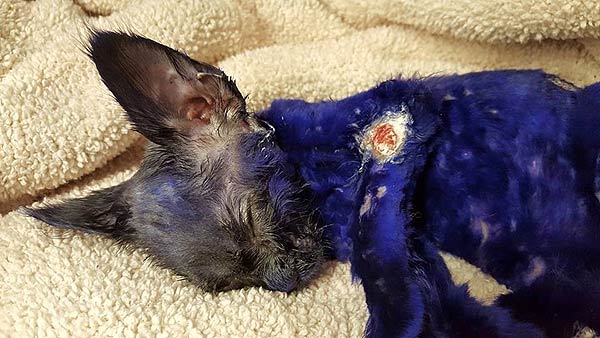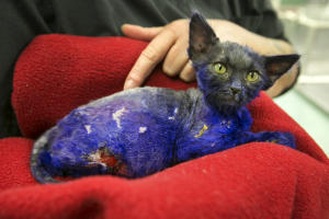 At less than 8 weeks old and less than 2 lbs of weight, Smurf the kitten was found in a cardboard box with purple rags and lemon slices in San Jose, California. He was battered and bruised and his coat was dyed in purple ink. The doctor who was caring for him stated, “I believe that, for someone’s amusement, this kitten was used as a chew toy for their dog,” siting many dog bite wounds on Smurf. When he was brought into the Nine Lives Foundation shelter, he had 20 deep wounds and a fever of 105 degrees.