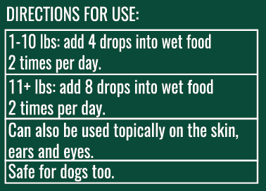 Oxy-Cat is perhaps our most multifaceted product. Used internally, this easy-to-add liquid contains powerful anti-viral and anti-fungal properties and balances the pH levels of stomach acid in our friendly felines. It also oxidizes and cleanses toxins and free radicals without harming the beneficial flora of the gut. Used topically, this pawsome formula fights parasites and heals wounds. Used in a vaporizer, Oxy-Cat will provide respiratory support, breaking up congestion in the chest. It’s a must-have for every kitty household!