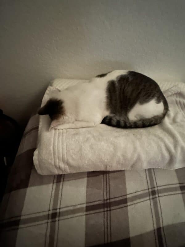 Seems to be helping Cosmo’s hyperesthesia, which may have come from trauma since he was on the street as a kitten. He was picked up at 4-5 mo old covered with fleas and lots of ear mites. He seems less suspicious and wary; and; the sensitivity tp touch seems sllghtly less,